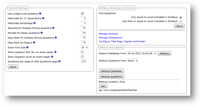 The control panel can be accessed by the Examination Manager only (Admin level 1). The Control Panel has settings which can be configured to change the way that QBgenerator functions. The following is a list of these settings.