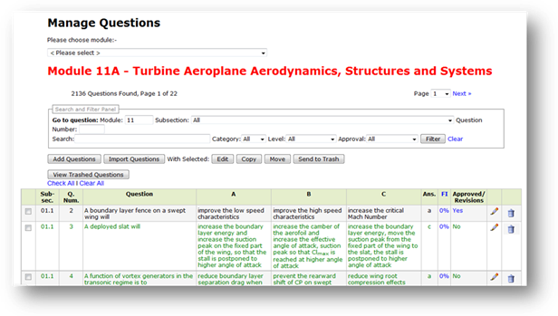 · You can filter the questions by Category (default is All), by Level (default is All), and whether Approved (black and red questions) or Unapproved (green questions).